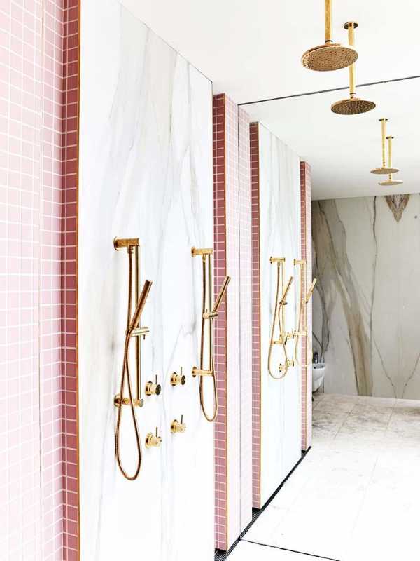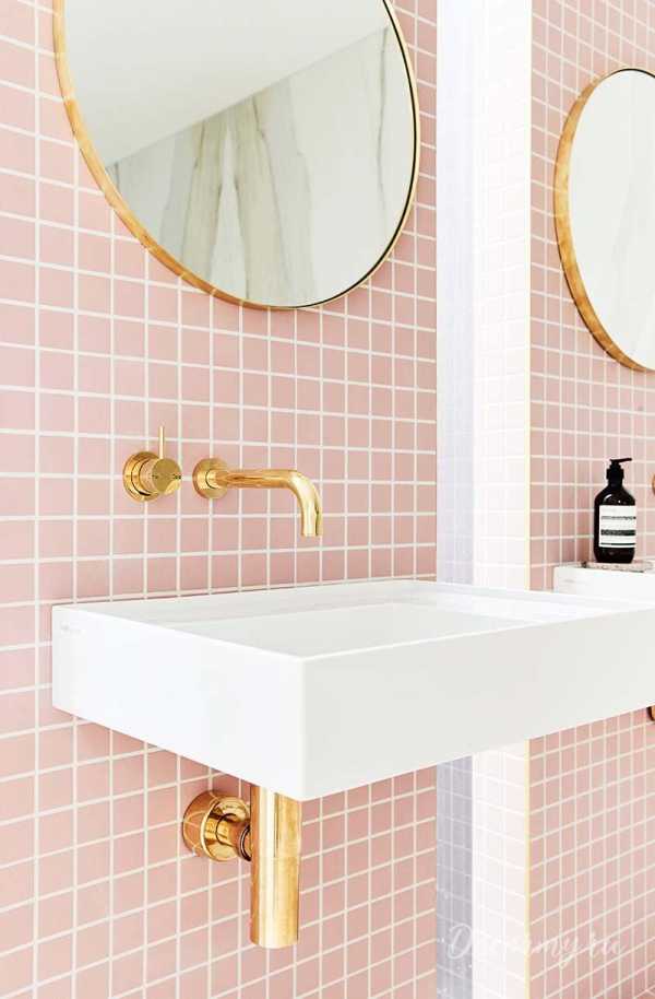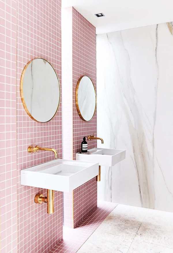Льстящий цвету лица розоватый оттенок прекрасно работает в ванных. В сочетании с латунными аксессуарами вы получите классический интерьер в розовых тонах, а выбрав хром и добавив темных акцентов — например, плитки с графичным рисунком — сделаете современный интерьер.
