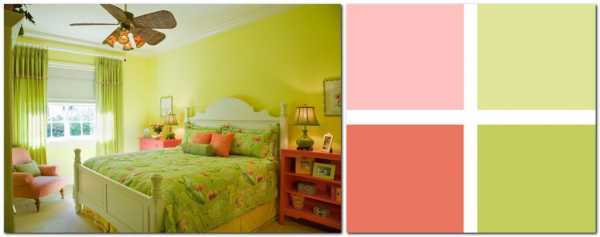 Сочетание розового цвета с зеленым придает спальне оптимистическое настроение. При таком тандеме цветов необходимо, чтобы преобладала зеленая палитра, в то время как розовая лишь дополняла общую задумку.