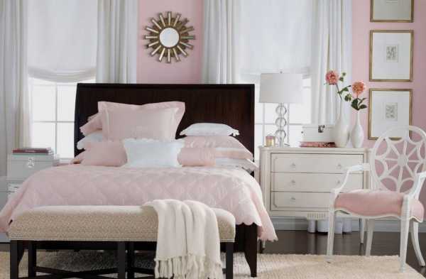 При отделке розово-коричневой спальни стены следует отделать в коричневом цвете, а мебель – в светлых тонах, можно в белом. Занавески и покрывала могут быть светло-розовыми.