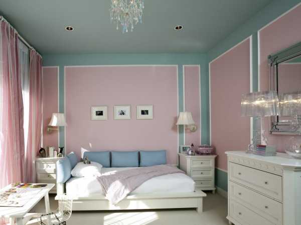 Потолок, оформленный в голубом цвете, смотрится модным на фоне стен, отделанных рамным образом с акцентом на розовые части. А вот мебель и пол лучше всего отделать в белоснежном цвете. Дабы добиться баланса в дизайне, можно купить розовые плед и занавески.
