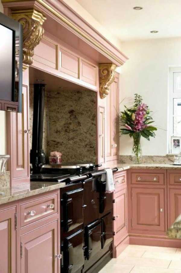 Кухня с упором на розовый цвет – уютное гнездышко, признак того, что в доме царят мир да покой, живут радушные и хлебосольные хозяева. В сочетании с белым или ореховым цветом даже яркие вспышки розового (например, фасады мебели) никого не будут раздражать, угнетать аппетит. Напротив, психологи подметили, что розовый цвет, видимо, потому, что ассоциируется с ягодами-фруктами, увеличивает тягу к сладкому.