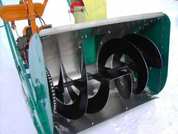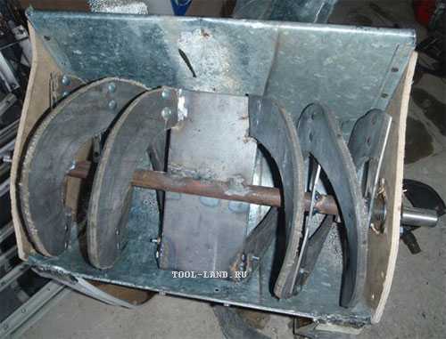 Для ковша понадобится лист 2 мм такой же длины как шнек + по краям по 2-3 см. Выгибают его по спирали так, чтобы радиус был на 2 см больше диаметра ножей. Боковые стенки лучше сделать тоже металлическими, но подойдет и толстая фанера. В центре вставляют ступицы и ставят сделанный шнек. Предварительно на цапфу одевают шкив ременного привода. По верху ковша нужно сделать подобие рукава с козырьком, чтобы направлять в нужную сторону выбрасываемый снег.