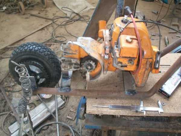 На нижней части аппарата устанавливают две трубы. Двигатель берут из бензопилы и дорабатывают его. Вместо стандартной звездочки, на которой держится цепь, ставят маленькую звезду, ее берут с мотоцикла. Приваривают элемент, но сначала следует его отрегулировать.
