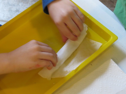 Затем они сложили или скатали мокрое бумажное полотенце и положили его на дно мешочка…