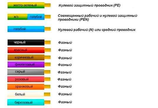 Чтобы во время монтажных работ не путать проводники, их изоляцию окрашивают разным цветами. К фазным жилам не предъявляется жёстких требований, поэтому их цвета могут отличаться. Заземляющий (PE), нулевой (N), а также объединяющий два предыдущих (PEN) окрашены только такими цветами: