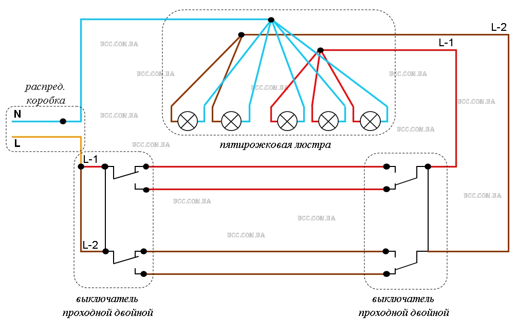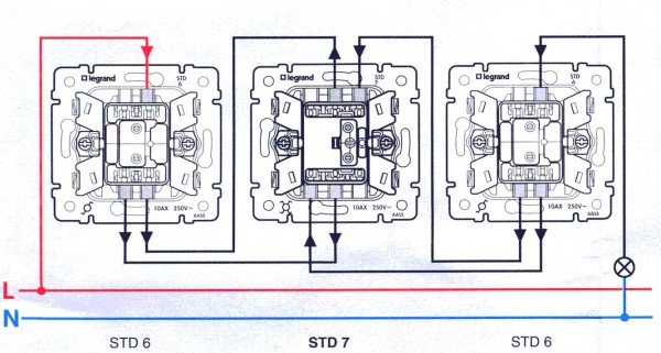 Схема подключения проходных выключателей на 5 точек
