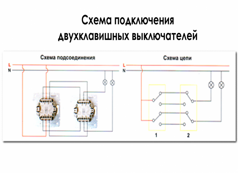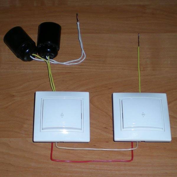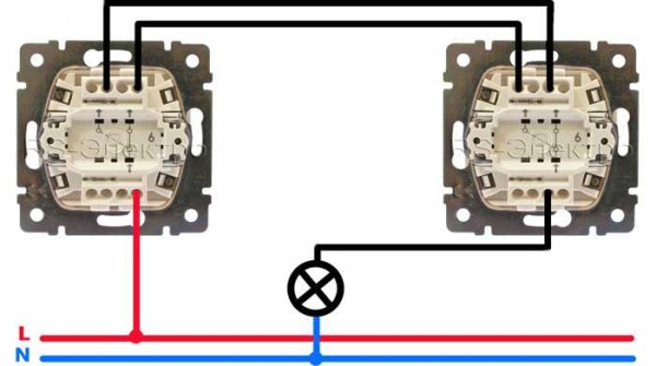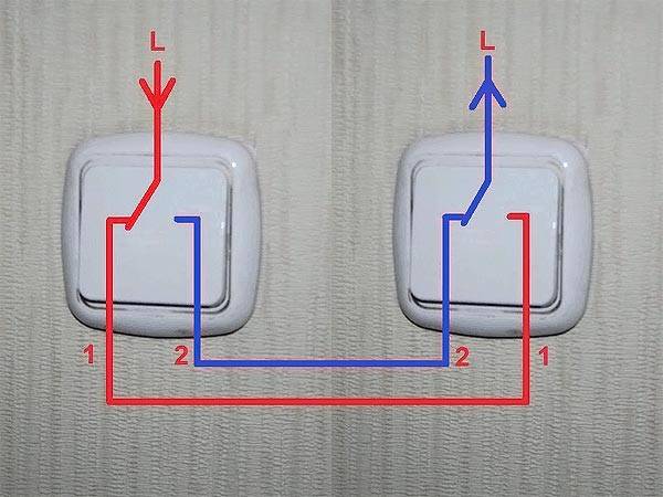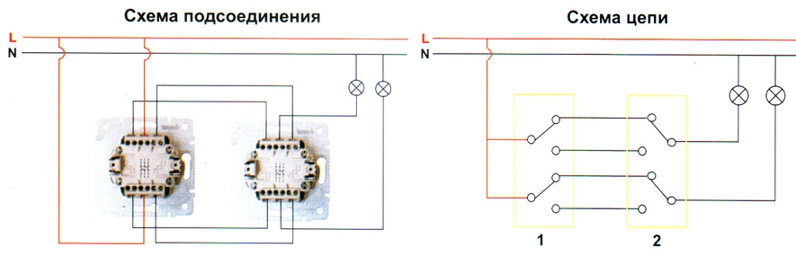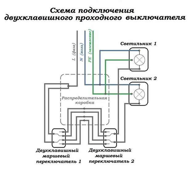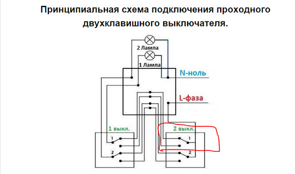 Принцип подключения двухклавишных проходных выключателей
