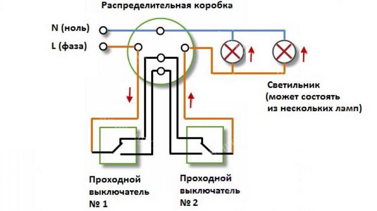 Двухклавишный проходной выключатель: схема подключения