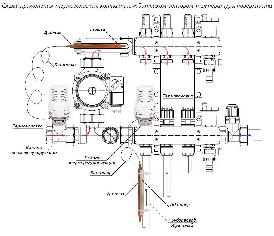 Для регулировки нужной температуры к контурам подключается обратка и устанавливаются потоки смешения.