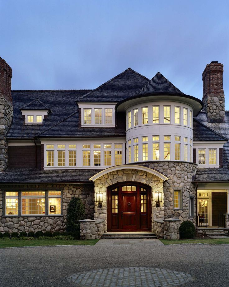 Из него редко строят дом, поскольку как материал природный камень – самое дорогое удовольствие, но его активно применяют как частичную отделку фасадов. Это настолько красиво, что даже самый простенький коттедж, отделанный камнем, способен вызвать зависть всех соседей, что уж говорить о том, что чаще всего архитекторы применяют его в строительстве частных «замков». Это удовольствие для очень богатых клиентов.
