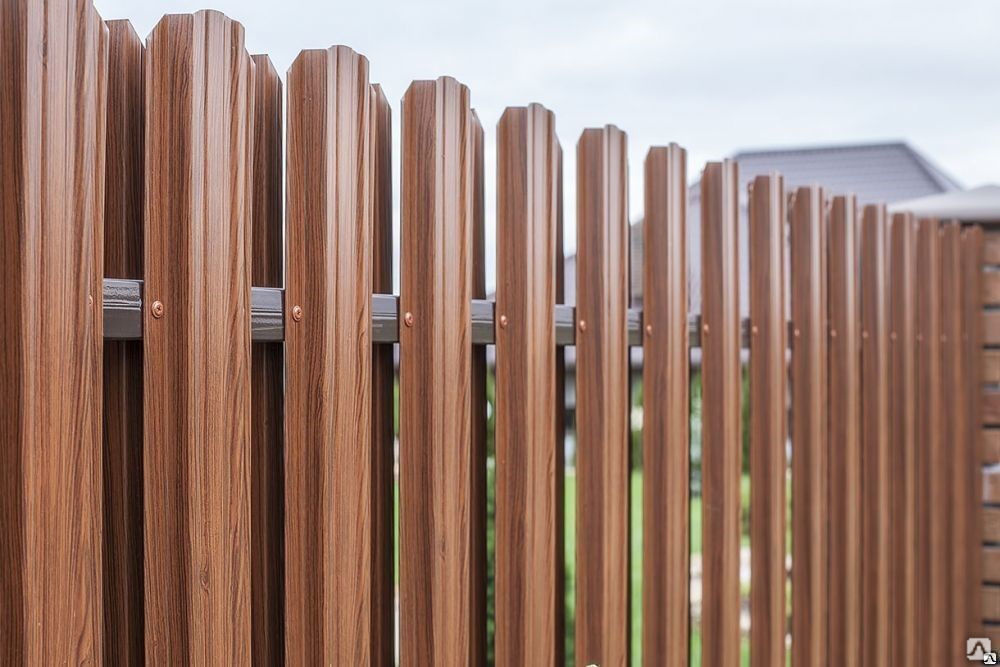 Если металлические штакетины окрашены под дерево, такой забор внешне не отличается от деревянного. Только он не темнеет, и не придется каждый год красить или заменять сгнившие части.