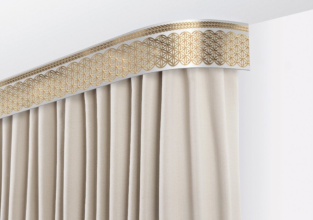 Это тип с современным дизайном представляет собой плоскую планку, элементарную в установке. Данный карниз будет отлично смотреться в интерьере с большими окнами, а традиционные массивные модели замечательно отражают характер более узких проемов.