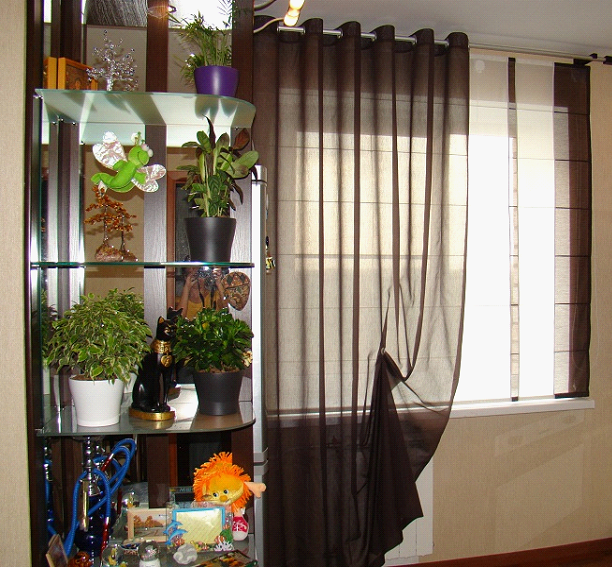 Комбинация воздушных видов ткани со светонепроницаемыми рулонными шторами смотрится очень современно и способна удивить любых гостей.