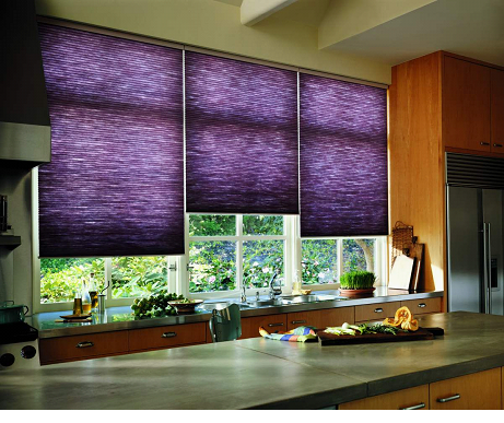 Рулонные шторы «день-ночь» внешне напоминают жалюзи, но с более совершенной конструкцией. Преимущество таких штор в том, что они состоят из цельного отреза специальной ткани различной плотности, которая контролирует подачу света за счет соприкосновения и раздвигания полос жалюзи. С помощью подъемного механизма открываются «окошки» для дневного света, что соответствует положению «день». Когда полосы совмещаются, заставляя «окошки» слиться в единое полотно – это соответствует положению «ночь». Такие шторы удобны для кухни, а различные цветовые решения могут придать изюминку в любой интерьер.