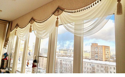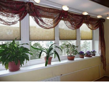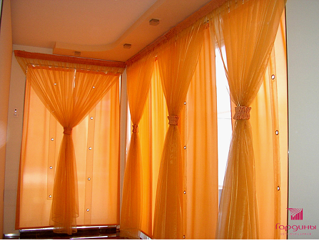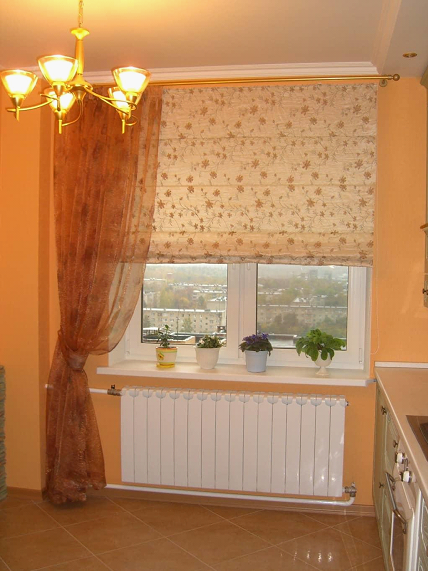 Снова на пике моды. Особенно удачным становится решение при комбинации плотных рулонных штор и ламбрекена из легких светопрозрачных тканей, например, органзы.