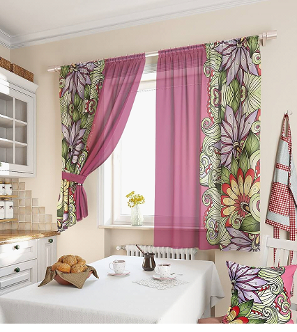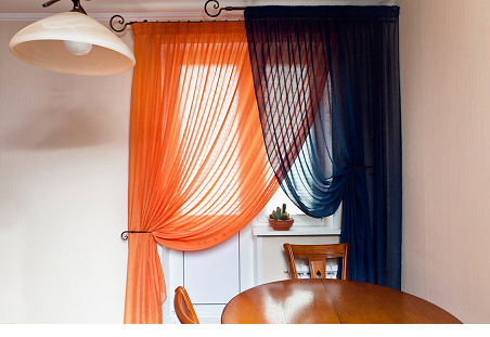 Определяясь с материалом, лучше выбрать натуральные или смешанные материалы. Такие ткани по максимуму комфортны в быту – они пропускают свежий воздух, свет и легки в уходе. Специалисты рекомендуют определенные ткани для создания кухонных штор: полиэстер, тюль, ситец, лён и шелк.