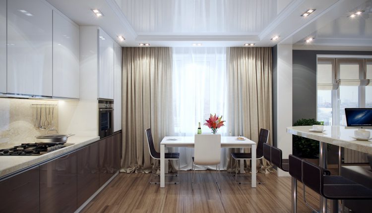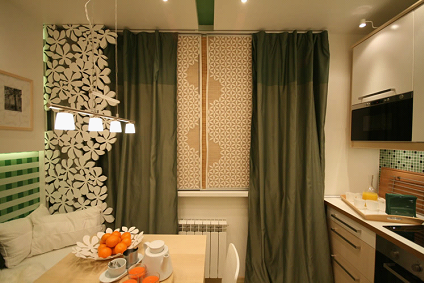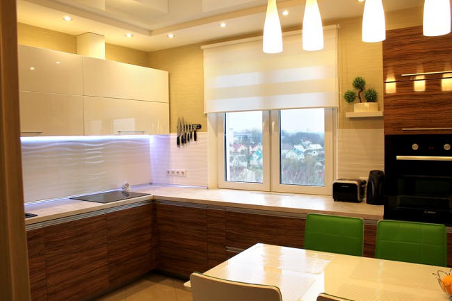 Еще одним преимуществом рулонных штор перед обычными – является отсутствие карниза. А в случае, когда в помещении находятся два окна – можно оригинально зонировать пространство кухни.