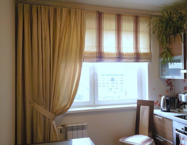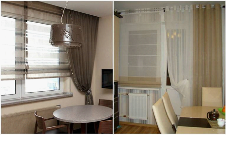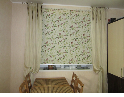 Кухня приобретет уютную домашнюю атмосферу, если сочетать строгие рулонные шторы с различными видами ткани. Тут главное не забывать о чувстве вкуса, чтобы не испортить вид такого смелого и оригинального окна.