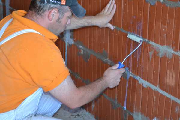Это обязательная процедура подготовки стены к оштукатуриванию, которую часто пропускают новички, считая грунтование стен излишним. Нанесение грунтовочного раствора глубокого проникновения позволяет существенно уменьшить пористость поверхности и усилить адгезию кирпичной кладки и раствора.