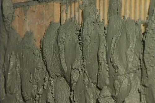 На первом этапе проводят нанесение подготовительного слоя – обрызга. Для первого слоя желательно увеличить долю вяжущего вещества в смеси, консистенция раствора – густая сметана.