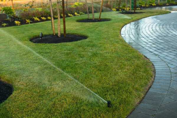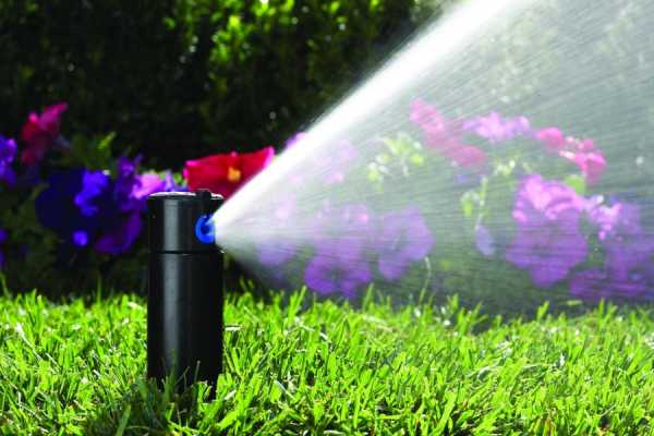 Газон поливается с помощью выдвижных спринклеров с регулируемыми соплами на концах выдвижного штока. Проще всего понять, как это происходит, посмотрев видео.