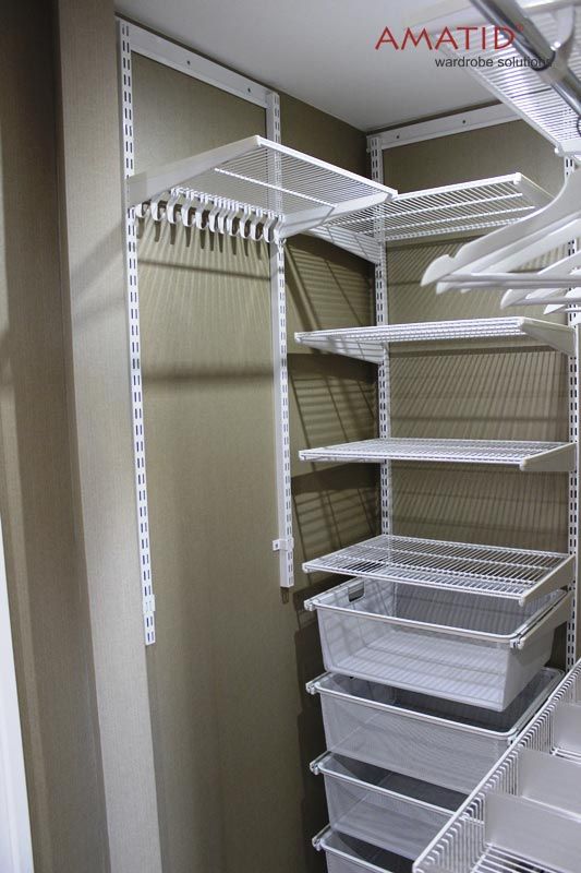 Еще существуют сетчатые гардеробные. В них, как правило, используется много корзин и полок, которые прикрепляются к стенам комнаты. Такая система достаточно удобна, так как она подразумевает широкие возможности комплектации и множество мест для хранения любого объема или назначения, что позволяет создать гардероб под свои персональные потребности.
