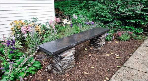 Для каменной скамейки основание может быть выполнено из камня, кирпича, металла или дерева. Сама скамейка изготавливается из натурального или искусственного камня. В виде натуральной поверхности можно использовать любой цельный кусок, который попадется в продаже. Главное, одна поверхность его должна быть идеально ровной, а вторую можно легко подогнать во время изготовления ножек лавочки. Искусственную каменную плиту можно изготовить и самостоятельно, из бетонного раствора с добавкой мелкого щебня или мраморной крошки (для красоты), арматуры и специальной формы (которую также можно сделать самостоятельно). Если в бетонный раствор добавить специальные пластификаторы для экстремальных климатических условий, готовый камень прослужит на протяжении многих лет.