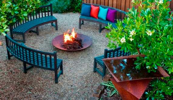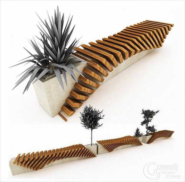 Скамейки изогнутой формы не только интересно выглядят, они позволяют оригинально обустроить места для сидения вокруг дерева, газона, когда сидящие располагаются к нему спиной или, наоборот, лицом внутрь изгиба. Последние конструкции уместны, если группа людей занимает места вокруг чего-либо, например у очага.
