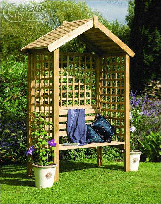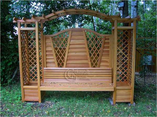 Арочная двухсторонняя пергола со скамьей и цветочницей