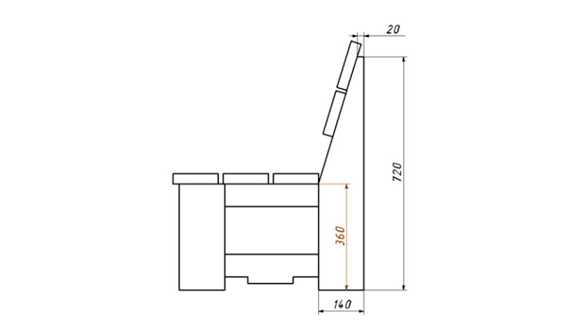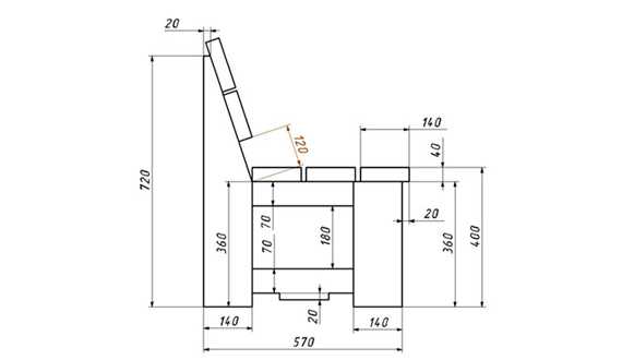 - 2 доски 720х150х40 мм для держателя ножки и спинки. На них выполняем срез, как демонстрирует чертеж. Это позволит расположить спинку под удобным наклоном.