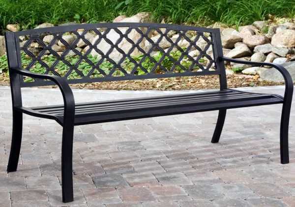 Чисто металлическая садовая лавочка – большая редкость. Железо в качестве материала для скамьи обладает рядом недостатков: холодная поверхность, жесткость, сложность обработки и другие. Единственный фактор, благодаря которому металл иногда предпочитают дереву, – более долгий срок службы. Недостатки материала можно легко обойти, если использовать мягкие накладки на сиденье и спинку.