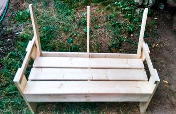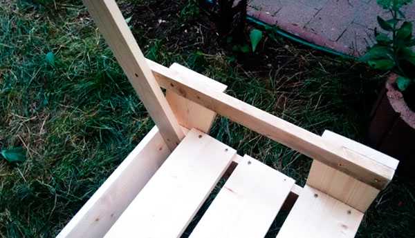 - чтобы усилить конструкцию, сверху и снизу соедините ножки брусом, для спинки закрепите две доски;