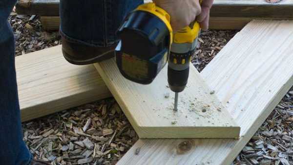 После того, как ваши детали порезаны по размерам и отшлифованы, можно приступать к сборке. Для этого лучше использовать саморезы, но если у вас нет шуруповерта, то скамейку можно сбить гвоздями.
