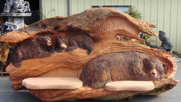 поменьше понадобится для изготовления спинки, большая будет – для сидения; - распилите бревно надвое и выровняйте поверхности деталей по месту спила, у вас должны получиться ровные плоскости, все неровности можно удалить при помощи бензопилы;
