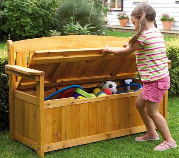 Удобная садовая деревянная скамейка со спинкой и ящиком отлично подойдет не только для отдыха, но и для хранения поливочных шлангов, горшков, инструментов и прочего инвентаря.