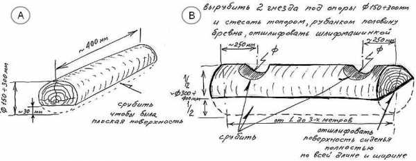 - если вы хотите сделать скамейку без спинки, последуйте приведенной ниже схеме, прорубите в верхней части одного из бревен два паза и поместите в них часть, предназначенную для сидения.