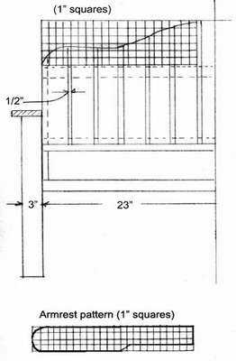 - Подлокотники изготавливают разными способами. Если одна из ножек уже служит опорой для горизонтального бруска, то остается только вывести последний от спинки.