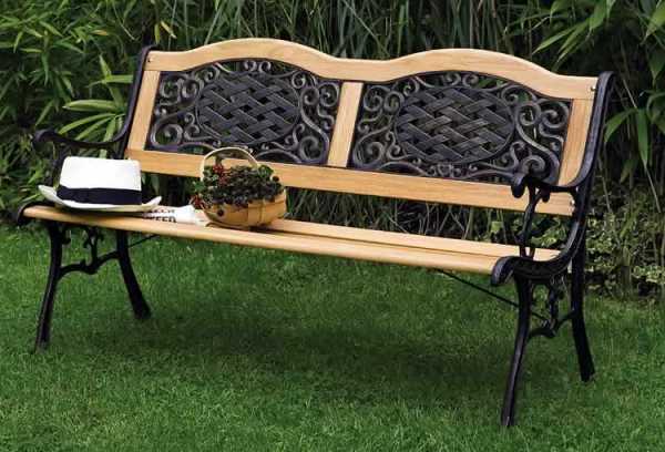 Комбинированный вариант, также заслуживающий внимания, – садовая лавочка из металла и дерева. Такая конструкция обладает рядом преимуществ: железный каркас повышает срок службы, а деревянные элементы спинки и сиденья легко заменить в случае поломки. Изюминку скамейкам добавляют кованые детали и фигурные подлокотники.