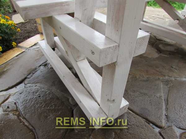 Если лавочка изготавливается из расчета ее периодической переноски, то желательно всю конструкцию усилить. В первую очередь это касается опорной части – ножек. Для этого производится их обвязка. В качестве «поперечин» используется брус или узкие доски.