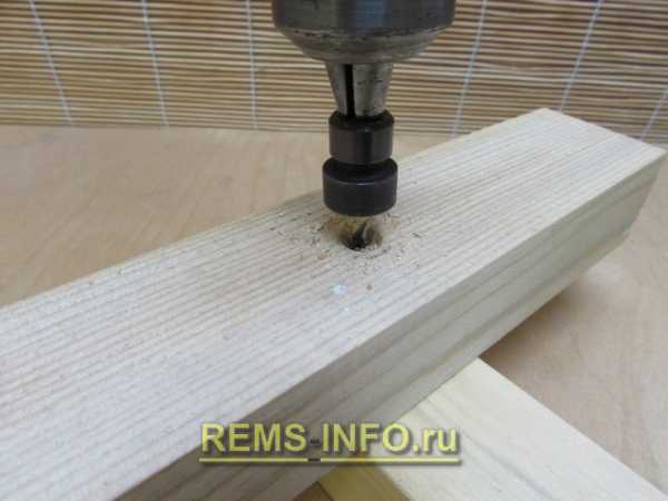 - В верхних торцах вертикальных ножек и в верхнем торце подпорной балки просверлить глухие отверстия глубиной 30 мм. Такие же соосные отверстия глубиной 20 мм нужно просверлить в нижней плоскости сиденья.