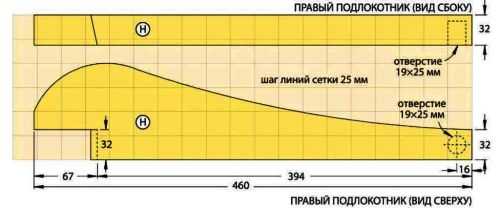 Подлокотник на скамейке тоже фигурный, его чертеж вы можете увидеть на рисунке ниже. Важно при изготовлении подлокотника помнить, что задняя боковина не ровная, поэтому паз под нее нужно делать тоже наискосок, чтобы при сборке не было щелей. Лучше всего вырезать паз когда уже собрана боковина и вы сможете приложить подлокотник и отметить нужный угол.