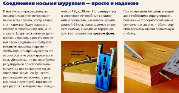 Вы можете посмотреть на схемах и картинках, как своими руками сделать такое соединение. Если у вас нет специального шаблона для косых отверстий, то вы можете сделать их и «на глаз». Такое соединение может быть просто неаккуратным, но эти соединения и так используются в тех местах, где их незаметно, поэтому внешний вид вашего изделия не пострадает.