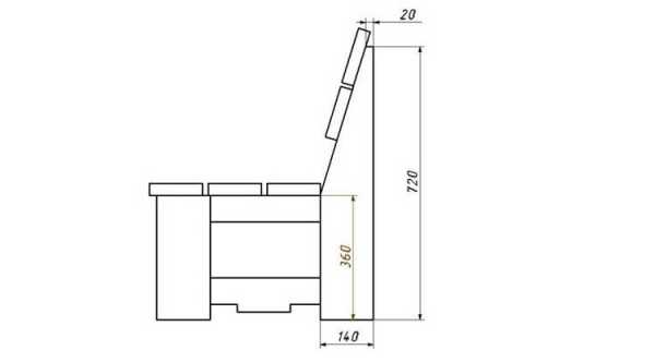 Длина лавки будет немного меньше внутреннего пространства беседки. Высота скамьи по сиденью – около 40 см, по спинке – около 80 см. Конструкция состоит из каркасных опор, скрепленных прямыми брусками. Спинку располагают под комфортным углом в 20°.