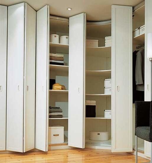 Системы складывания для дверей гардеробных, как правило, отличаются от межкомнатных вариантов тем, что внутренняя сторона створок имеет технический, а не декоративный характер, т.