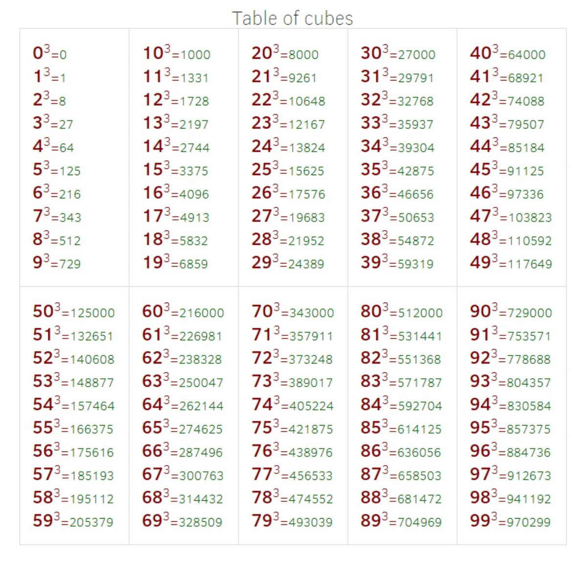 61=6 62=36 63=216 64=1296 65=7776 66=46656 67=279936 68=1679616 69=10077696 610=60466176 | 71=7 72=49 73=343 74=2401 75=16807 76=117649 77=823543 78=5764801 79=40353607 710=282475249 | 81=8 82=64 83=512 84=4096 85=32768 86=262144 87=2097152 88=16777216 89=134217728 810=1073741824 | 91=9 92=81 93=729 94=6561 95=59049 96=531441 97=4782969 98=43046721 99=387420489 910 =3486784401 | 101=10 102=100 103=1000 104=10000 105=100000 106=1000000 107=10000000 108=100000000 109=1000000000 1010=10000000000 |