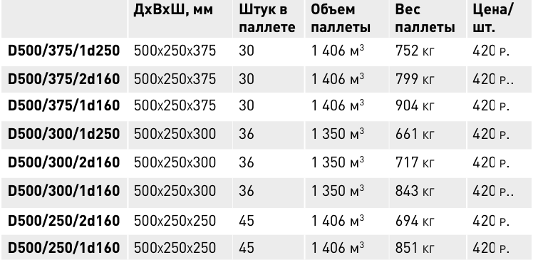 Размер блока | Объем 1 блока | Количество м.куб. в 1 поддоне | Количество блоков в поддоне (шт) |