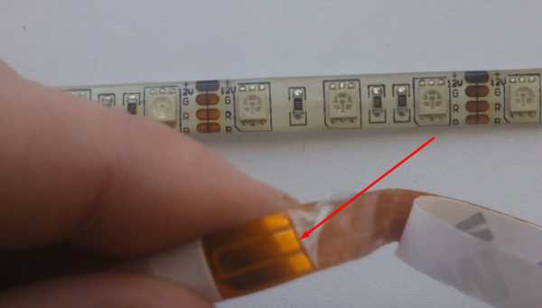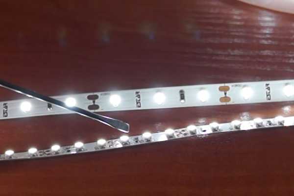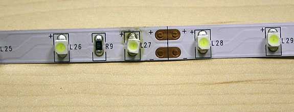 Например у ленты SMD3528 на таком сегменте располагается 1 резистор и 3 светодиода. У ленты SMD5050 для каждого светодиода установлен свой резистор. По краям сегмента расположены линии разреза и места под пайку. Таким образом при необходимости ленту можно укоротить только на длину кратную длине сегмента.