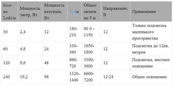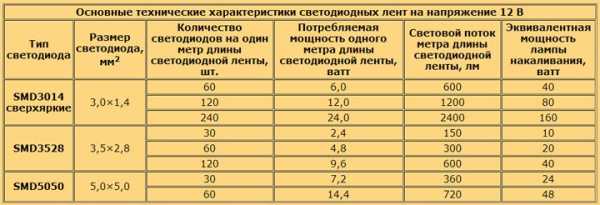 Сравнение технических характеристик светодиодных лент SMD3528, 5050, 5630, 5730 сведенные в одну таблицу: