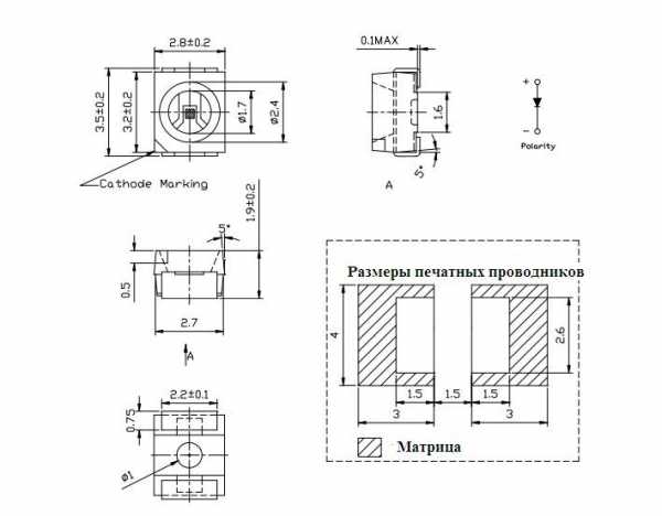 Любой светодиод из серии SMD имеет обозначение из четырех цифр. Основываясь на них мы можем сразу получить информацию о размерах чипов. первые две — длина, вторые — ширина. Размеры указываются в мм. У разных производителей бывают свои погрешности, но они не выходят за рамки +-0,1-0,15 мм.