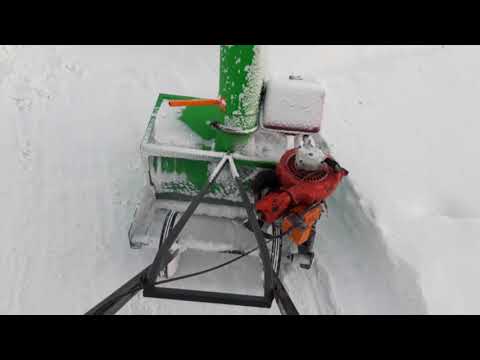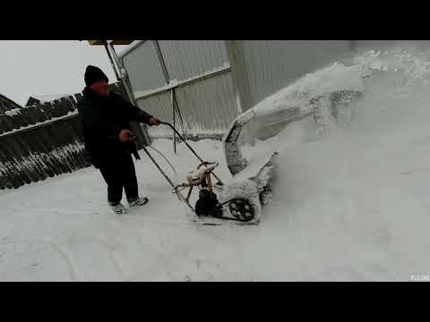 Все детали снегоуборщика готовы. Осталось их собрать в одну конструкцию, установить на триммер. Первым делом редуктор мотокосы прикручивают болтами к торцу корпуса. Вал должен свободно вращаться без зацеплений. Корпус болтами фиксируют к раме. В зависимости от выбранного механизма передвижения снегоуборщика, устанавливают колесики или лыжи. На вал редуктора надевают крыльчатку. Пробуют руками прокрутить, убеждаясь в свободном ходе. Запускают двигатель мотокосы. Пробуют пройтись снегоуборщиком по снегу. Ручкой управления служит штанга триммера. Если все правильно собрано, во время движения снегоуборщика из отводящего колена полетит снег.![]()